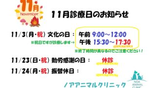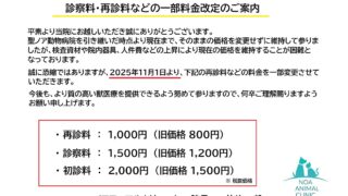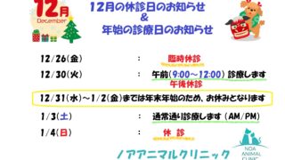 ノアアニマルクリニックの前谷です。早いものでもう12月ですね。毎月のお薬をお出しする方には、年末のお休み期間中に薬がなくならないように少し長めにお出ししたりもしてますので、ご相談ください。お薬やいつも食べているフードなどをご注文、あるいは購...