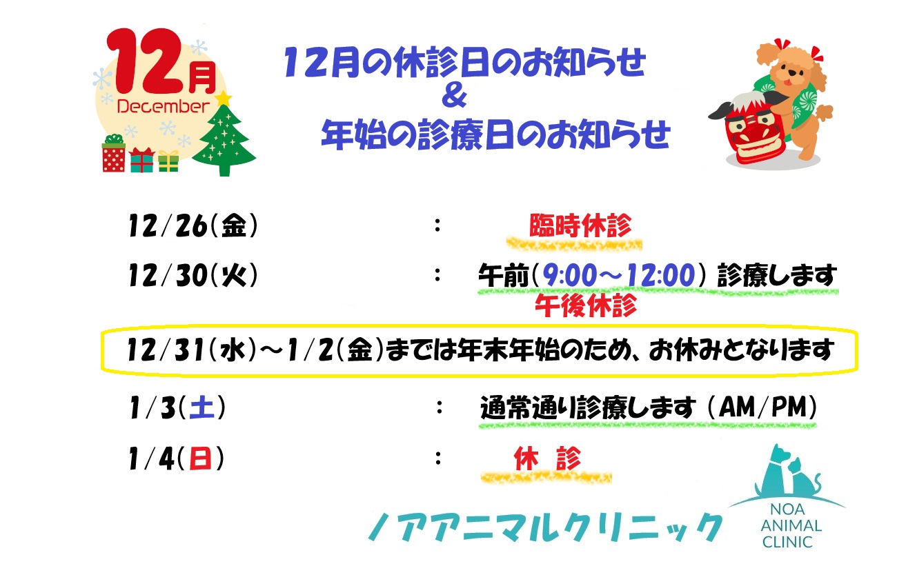 12月の予定になりますが、12/26(金)が『臨時休診となっておりますので、ご注意ください。